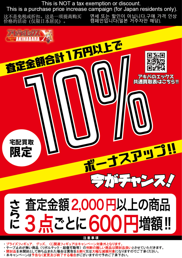 イベント情報 event 【宅配買取限定】買取ボーナスキャンペーン実施中 アキバのエックス宅配買取では、査定金額合計が10,000円以上となった場合、10%のボーナスアップを実施するキャンペーンを実施致します。ボーナスアップは、買取表に掲載していない商品も対象となり、開封・未開封も問いません。 さらに、査定金額2,000円以上の商品は3点ごとに600円増額されます!!アキバのエックスの買取をこの機会に是非ご利用ください。 買取上限金額一覧はコチラ! 宅配買取のご案内はコチラ!
