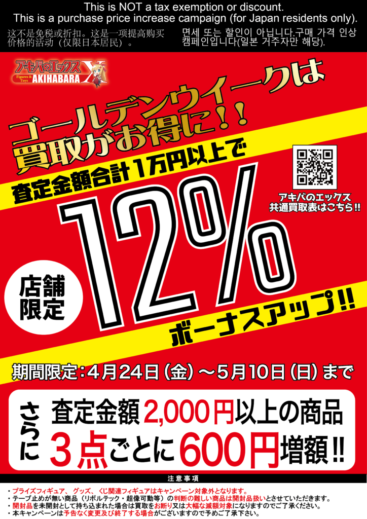 2026年4月24日~5月10日の期間限定で、アキバのエックス実店舗各店では、査定金額合計が10,000円以上となった場合、12%のボーナスアップを実施するキャンペーンを実施致します。ボーナスアップは、買取表に掲載していない商品も対象となり、開封・未開封も問いません。