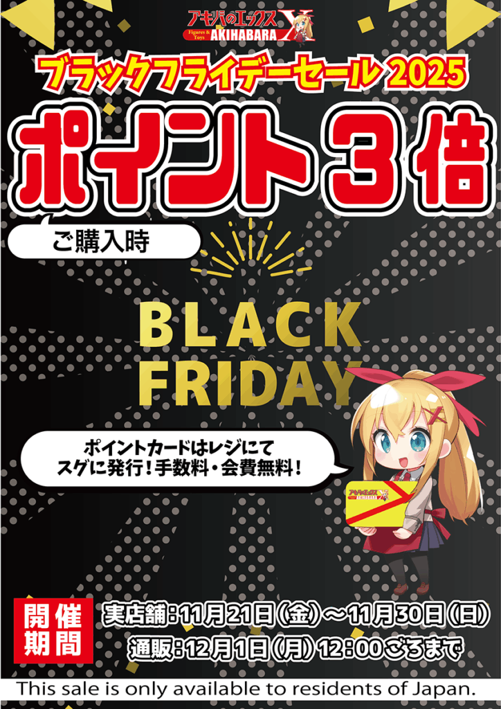 セール sale (終了しました)ブラックフライデーセール2025開催! 下記期間中、アキバのエックスでのお買い物時のポイントが3倍になります! 店舗:2025年11月21日(金)~2025年11月30日(日) 通販:2025年12月1日(月)12:00ごろまで この機会にどうぞご利用ください。店舗のポイントカードは、お会計時に無料でスグ発行できます。