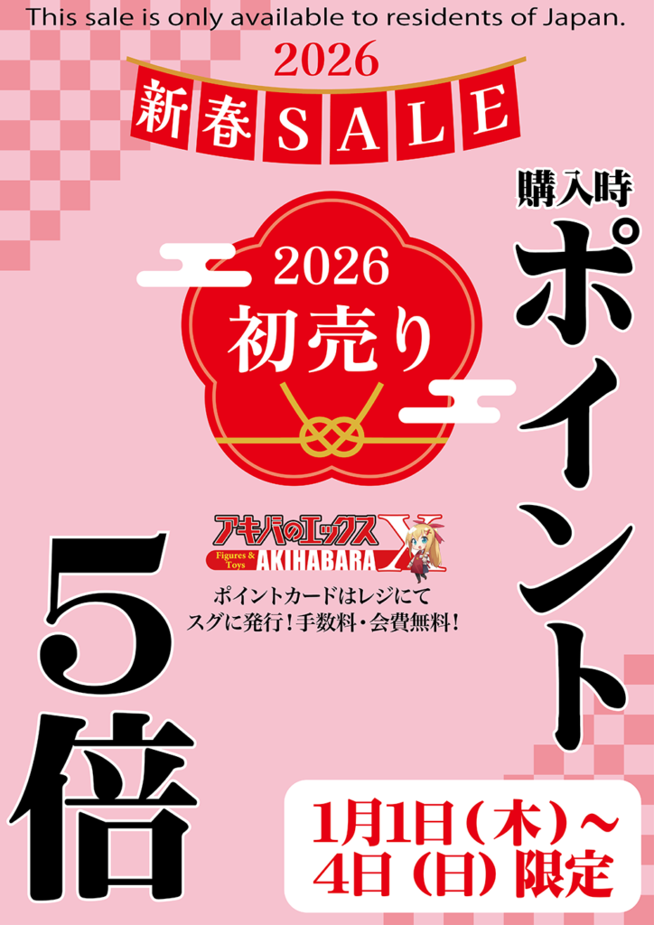 セール sale 【店舗限定】初売り!新春セールを開催します! 下記期間中、アキバのエックス実店舗でのお買い物時のポイントが5倍になります! 2026年1月1日(木)~2026年1月4日(日) この機会にどうぞご利用ください。店舗のポイントカードは、お会計時に無料でスグ発行できます。